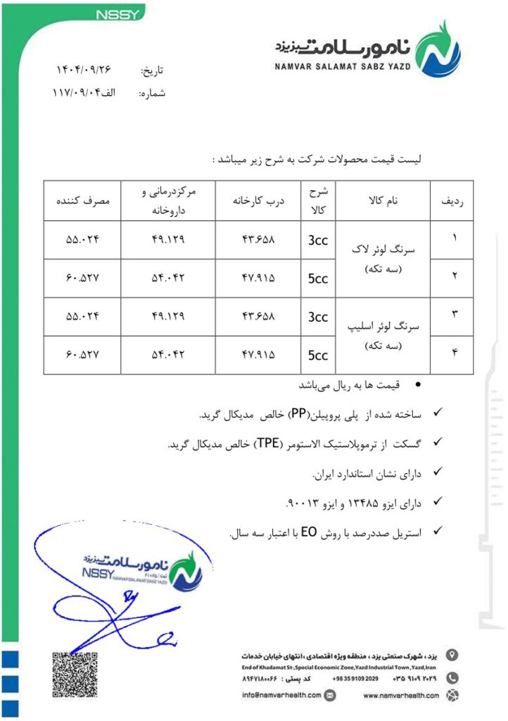 .ادرس کارخانه: یزد شهرک صنعتی منطقه ویژه اقتصادی انتهای بلوار خدمات شرکت نامور سلامت سبز یزد